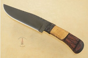 Antiqued maple scales are set on a distal tapered full tang. The scales feature tribal markings. A distal taper to both blade and tang ensures perfect balance.