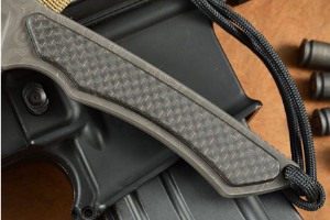The blade on this limited edition Phrike is made from Chad Nichols' stainless raindrop damascus, ensuring both beauty and a long lasting, keen edge. Lightning strike carbon fiber scales are inlaid into the integral handle creating a sure grip. This type of carbon fiber was originally designed for use on fighter jets to redirect electricity. Lightning strike carbon fiber is among the hardest to find knifemaking materials. A Spartan helmet bead at the end of the lanyard adds a nice finishing touch.