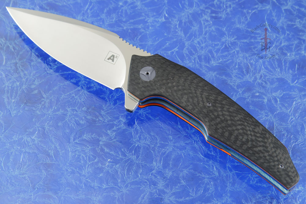 Handle: Black carbon fiber set on anodized titanium liners with orange G-10 spacers