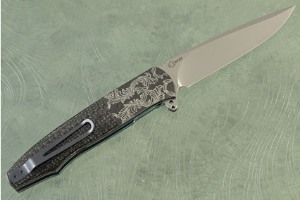 Handle scales are silver strike carbon fiber that have been nicely domed and polished. This variation of lightning strike carbon fiber uses silver toned wire (rather than copper) woven through the carbon strands. Jimping on the thumb ramp provides a comfortable, secure grip. The gently rounded handle feels sturdy and fills out the hand perfectly. The engraved, anodized zirconium bolsters provide a steadfast grip that is also very beautiful. Zirconium is a transitional metal that is primarily mined in South Africa and Australia. It is highly resistant to corrosion and scratching. Titanium liners have been fileworked and differentially anodized. A black G10 backspacer helps keep the knife light, yet strong. The pierced pocket clip is formed from titanium with a durable Titanium Aluminum Nitride (TiAIN) coating and is mounted for right-handed, tip-up carry.