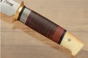 This hunting knife is very true to Scagel's design -- from the carbon steel upswept blade to the leather handle with stacked spacers. Doug chose to follow the color themes used by Scagel, combining leather and steel along with red and black fiber spacers. An ancient walrus ivory pommel completes the handle. The resulting handle is both dramatic and extremely comfortable. The front of the bronze guard has been beveled and fits perfectly to the 5160 carbon steel blade. A hand satin finish lends an heirloom quality. The knife is accompanied by a hand tooled laced leather sheath.