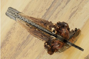 The blade was forged to shape from his own damascus, beginning with carbon steels. The blade is hand fileworked along the entire length of the spine. The action is smooth and the backlock provides a safe, firm lock.