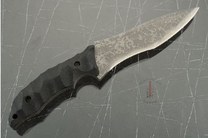 This Hurricane Special is handmade by him and shows his skill at its best. It is made from thicker stock than the standard Hurricane. The OU-31 stain resistant tool steel blade will have exceptional edge holding. OU-31 is a Japanese PM (powdered metallurgical) steel with micro fine crystalline structure that embodies many of the best attributes needed for knives. The steel is hardened to 64 Hrc (very hard!) and has more than 3 times the toughness of D2. The blade features Kiku's high performance Hamaguri (convex) grind at the front and a hollow grind toward the handle -- combining a very strong edge with a precision cutting edge. The blade features a non-reflective disruptive acid finish. The thumb ramp is textured for a secure grip. The canvas Micarta handle is carved and set on the substantial full tang.