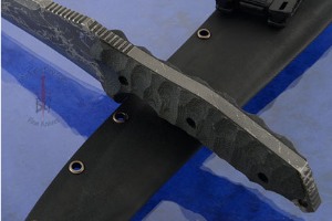 Hayataka is a massive chopper. It is handmade by Kikuo and shows his skill at its best. The blade, which measures in a just under 12-1/2 inches is surprisingly nimble for its size. Kikuo used OU-31 tool steel for the blade, which has exceptional edge holding. OU-31 is a Japanese PM (powdered metallurgical) steel with micro fine crystalline structure that embodies many of the best attributes needed for knives. The steel is hardened to 64 Hrc (very hard!) and has more than 3 times the toughness of D2. The blade features Kikuo's high performance Hamaguri (convex) grind for a long lasting, precision cutting edge along with his non-reflective disruptive acid finish. The thumb ramp is textured for a secure grip. The canvas Micarta handle is carved and set on the substantial full tang.
