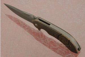 The copper handle is hand hammered and antiqued. The titanium liners, backbar, and pocket clip are acid stonewashed to match the blade. The pocket clip is mounted for right handed, tip-up carry. The titanium backbar is marked WC276 on the interior.