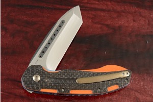 The handle is formed from contoured lightning strike carbon fiber set on orange G10 spacers. This type of carbon fiber was originally designed for use on fighter jets to redirect electricity. Lightning strike carbon fiber is among the hardest to find knifemaking materials. Blue anodized titanium liners keep the knife incredibly light. The titanium backbar has been anodized and textured. The titanium pocket clip is textured and anodized. It is mounted for right-handed tip-up, deep pocket carry.