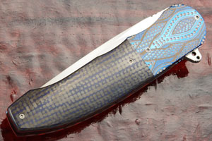 Bolster: Differentially anodized, heat colored, and engraved zirconium