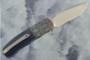 The scales black and blue carbon fiber that has been nicely domed and polished. Jimping on the thumb ramp provides a comfortable, secure grip. The gently rounded handle feels sturdy and fills out the hand perfectly. The engraved, anodized zirconium bolsters provide a steadfast grip that is also very beautiful. Zirconium is a transitional metal that is primarily mined in South Africa and Australia. It is highly resistant to corrosion and scuffing. Titanium liners rest against red fiber spacers and have been fileworked and anodized. A black G10 backspacer helps keep the knife light, yet strong. The machined titanium pocket clip is mounted for right-handed, tip-up carry. A ceramic ball bearing set at the end of the clip makes it particularly easy to use.
