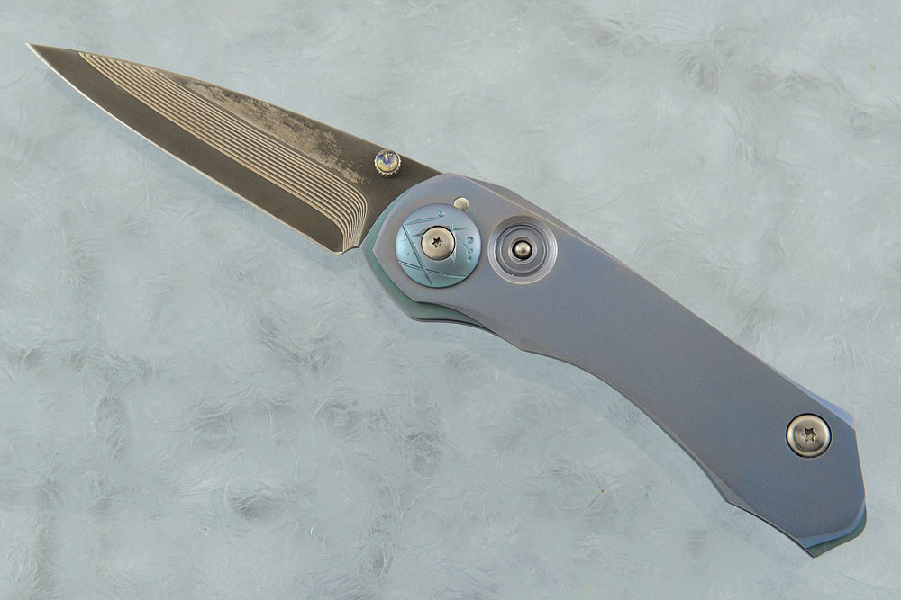 Titanium construction keeps the knife light and fast. The titanium is anodized to blue/purple tones. It is easy to keep this knife close at hand using the titanium pocket clip which is mounted for tip up, right handed carry.