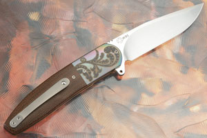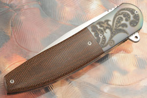 Zirconium bolsters are hand engraved, textured, and heat colored by Marietjie Thorburn, ensuring a positive grip. Zirconium is a transitional metal that is primarily mined in South Africa and Australia. It is highly resistant to corrosion and scuffing. Titanium liners are anodized bronze. The liners surround a black G10 backbar. The 3D machined titanium pocket clip with ceramic retention ball is mounted for right-side, tip-up carry.