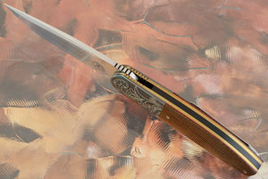 The blade is formed from N690 stainless steel created by Bohler in Austria. It takes an incredibly sharp edge and holds onto it. Increased toughness gives it better resistance to edge chipping. The blade is hollow ground for an easy to maintain edge. By differentially finishing the blade, Andre has emphasized his clean grind lines.