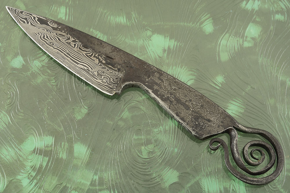 The grinds reveal the detailed damascus pattern. The flats of the blade and handle are forge finished, with the spine and base of the handle again revealing the damascus pattern hidden within. The blade is nicely distal tapered for a perfect balance. The choil is nicely rounded for a secure, comfortable grip. The end of the handle moves into a twisted spiral -- a playful twist on David's classic Shop Rat.