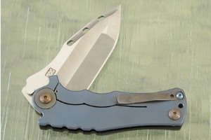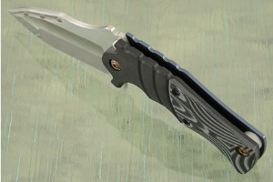 The blade is CPM154 stainless steel -- one of the "super-steels." This powdered metallurgical steel has a particularly small grain structure, making it take an extremely keen edge and hold it! The differentially finished blade has a stone wash finish in the flat grind and flats along with a satin finish in the central fuller. The blade is a stout pseudo-tanto shape with an aggressive geometry. A distinguishing feature of this knife is the way the blade opens and locks at a canted angle. This gives it a crescent shape rather than pointing straight out from the handle. The unique look offers both an ergonomic pistol grip and an excellent reverse grip. This knife uses ball bearings ensuring a silky smooth opening and a perfectly centered blade. A flipper offers a one handed operation as well as acting as a hilt in the open position.