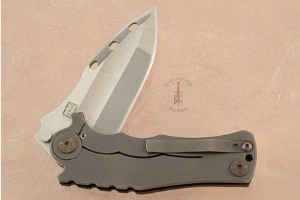 The blade is CPM154 stainless steel -- one of the "super-steels." This powdered metallurgical steel has a particularly small grain structure, making it take an extremely keen edge and hold it! The differentially finished blade has a stone wash finish in the hollow grind and a satin finish in the flats and fuller. The blade is a stout pseudo-tanto shape with an aggressive geometry. A distinguishing feature of this knife is the way the blade opens and locks at a canted angle. This gives it a crescent shape rather than pointing straight out from the handle. The unique look offers both an ergonomic pistol grip and an excellent reverse grip. This knife uses ball bearings ensuring a silky smooth opening and a perfectly centered blade. A flipper offers a one handed operation, as well as acting as a hilt in the open position.