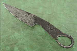David forges his shop rats very closely to shape. He began this Shop Rat with a bar of his own mosaic damascus. The blade and handle feature a forge finish along the flats and reveal the intricate damascus pattern in the grinds. His choice of steels, as well as his skillful heat treatment, ensures that this is not only a beautiful knife, but also a high performing tool. The handle is completed with a looped tail.