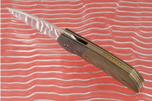 The clip point blade is made from N690 stainless steel hardened to 59HRC with a satin finish. N690 is a super-steel created by Bohler in Austria. It takes an incredibly sharp edge and holds on to it. Increased toughness gives it better resistance to edge chipping. The blade is hollow ground for an easy to maintain edge.