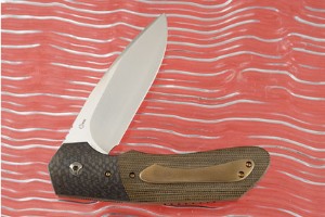 The handle is made from OD green canvas micarta that keeps the knife light and strong. The carbon fiber bolsters meet perfectly to the micarta scales. The liners, backbar, and pocket clip are formed from anodized titanium. The pocket clip is mounted right-handed tip-up carry.