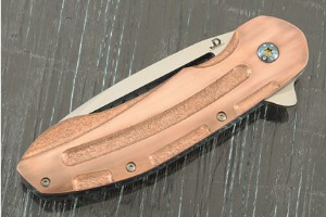 The handle is formed from carved and textured copper set on blue anodized titanium liners. The titanium backbar has been fileworked and differentially anodized to match the scales and liners. The titanium pocket clip is textured and anodized blue to match the liners. It is mounted for right-handed, tip-up carry.