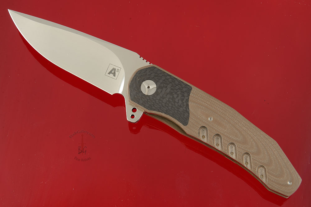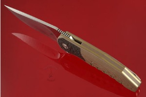 The scales are formed from Coyote brown G10. Carbon fiber 'bolsters' are inlaid into the handle scales. Jimping on the thumb ramp aids grip. The gently rounded handle feels sturdy and fills out the hand perfectly. The handle is completed with bronze anodized titanium liners and a coyote brown G10 backspacer. The machined titanium pocket clip is mounted for right-handed, tip-up carry and features a ceramic ball for excellent pocket retention.