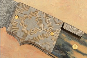 Bolsters are formed from mosaic damascus forged by Robert Eggerling. The bolsters are dovetailed to mammoth ivory scales for a perfect fit. Scales are formed from extremely rare green mammoth ivory bark. Ivory with any green is hard to come by. Ivory with the intensity and amount of green tones in this ivory is virtually unheard of. The handle is completed a leather lanyard.