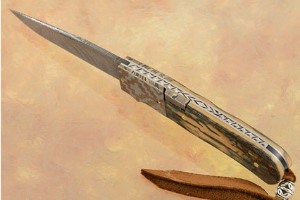 The blade is formed from feather pattern damascus forged by Robert Eggerling from carbon steels. The blade is hollow ground. The blade is easily opened using a thumb nick and closed using the damascus side lock. Excellent action with a perfectly centered blade.