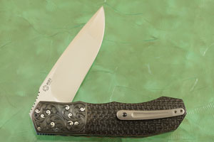 The scales are formed from silver strike carbon fiber. Aluminum wires travel through the woven carbon strands. Jimping on the thumb ramp provides a comfortable, secure grip. The gently rounded handle feels sturdy and fills out the hand perfectly.