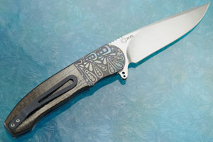 Handle scales are formed from carbon fiber. Jimping on the thumb ramp provides a comfortable, secure grip. The gently rounded handle feels sturdy and fills the hand perfectly.