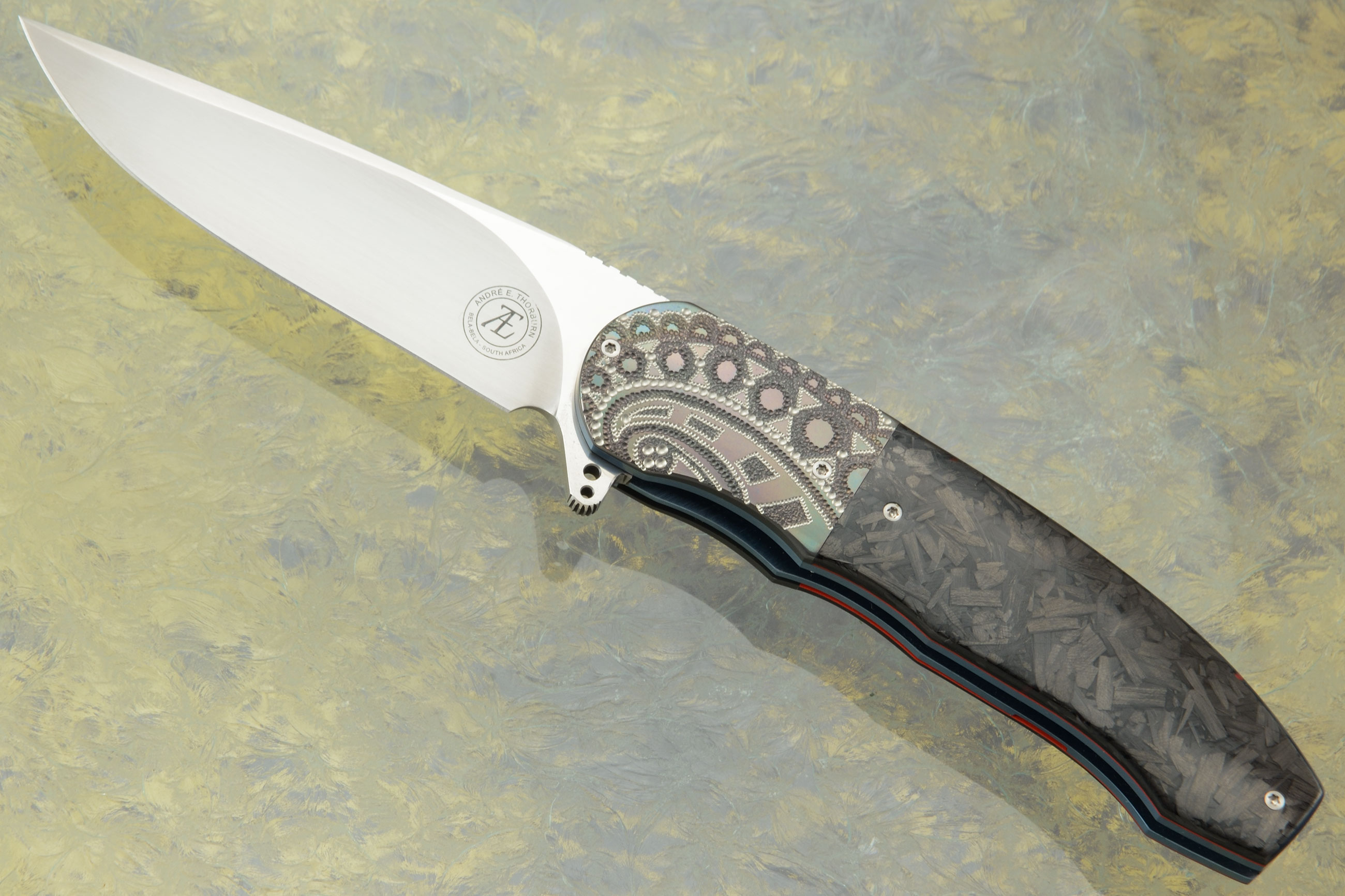 Handle scales are formed from shred carbon fiber. Jimping on the thumb ramp provides a comfortable, secure grip. The gently rounded handle feels sturdy and fills out the hand perfectly. Zirconium bolsters are hand engraved, textured, and heat colored by Marietjie Thorburn, ensuring a positive grip. Zirconium is a transitional metal that is primarily mined in South Africa and Australia. It is resistant to corrosion and scuffing. Fileworked titanium liners are anodized blue on the flats and purple on the bevels. The liners surround a G10 backbar. Red fiber spacers add a touch of contrast. The pierced, Ti-AlN coated titanium pocketclip with is mounted for right-side, tip-up carry.