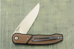 The scales are formed from black G10 and are inlaid with earth brown G10 inlays. The domed handle provides a comfortable, secure grip. Jimping on the thumb ramp aids grip. The flipper doubles as a front guard that keeps the hand from sliding forward onto the blade. The gently rounded handle feels sturdy and fills out the hand perfectly. The handle is completed with blue anodized titanium liners that elegantly contrast against black G-10 scales. The TiAlN coated titanium pocket clip is mounted for right-handed, tip-up carry.