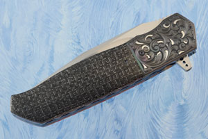 The scales are formed from silver strike carbon fiber. This variation on lightning strike carbon fiber has aluminum wires traveling through the woven carbon fiber. Jimping on the thumb ramp provides a comfortable, secure grip. The gently rounded handle feels sturdy and fills out the hand perfectly.