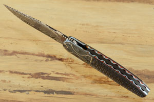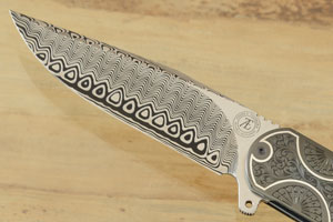 The clip point blade is stainless damascus forged by Damasteel in Sweden. This high performing stainless damascus is created using powder metallurgical steel manufacturing to provide excellent edge retention and unmatched beauty. The high contrast pattern is revealed in the grinds. The flats are mirror polished nearly hiding the pattern. The blade is hollow ground for an easy to maintain edge.
