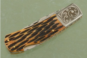 416 stainless steel bolsters are dovetailed to jigged bone scales. Mel engraved the bolsters in scrollwork, a nice complement to the blade. Jigged bone scales are set on brass liners. The backbar is hand fileworked matching the spine.