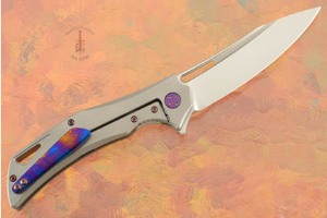 The handle is made from a titanium frame with an orange peel finish and features a sturdy frame lock. The left scale shows off a stunning Timascus inlay and matching anodized titanium hardware. The free floating backspacer is also made from titanium to keep the knife light. A matching Timascus pocket clip is mounted for right-handed, tip-up carry.