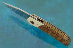 The handle is made from Thunderstorm Kevlar that keeps the knife light and strong. Ivory G-10 bolsters meet perfectly in an arc with the scales. The combination of colors is particularly beautiful. The liners, backbar, and pocket clip are formed from titanium. The textured pocket clip is mounted right-handed, tip-up carry.