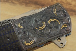 Engraved and anodized zirconium bolsters provide a steadfast grip that is also very beautiful. Belgium-born artist Julien Marchal studied engraving and gun making at Léon Mignon Liège in Belgium and now lives in South Africa. Floral scroll engraving and gold inlay shows his tremendous attention to detail and elegant designs. The handle is completed with red spacers and titanium liners that are anodized blue on the flats and purple in the bevels. A G-10 backbar keeps the knife light and fast. The 3D machined titanium pocket clip with ceramic retention ball is mounted for right-handed, tip-up carry.