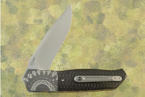 Carbon fiber scales have been nicely domed and polished. Jimping on the thumb ramp provides a comfortable, secure grip. The gently rounded handle feels sturdy and fills out the hand perfectly. The engraved, anodized zirconium bolsters provide a steadfast grip that is also very beautiful. Zirconium is a transitional metal that is primarily mined in South Africa and Australia. It is highly resistant to corrosion and scratching. Titanium liners rest against red fiber spacers and have been fileworked and anodized. A carbon fiber backspacer helps keep the knife light, yet strong. The machined titanium pocket clip with ceramic ball is mounted for right-handed, tip-up carry.