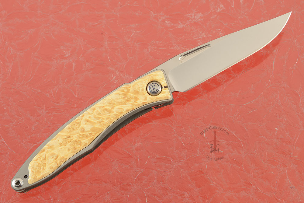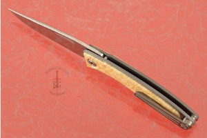 Handle: Premium box elder burl wood scales inlaid into a 6Al4V titanium frame