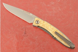 This Mnandi features premium box elder burl wood scales. The scales are inlaid into the frame rather than being simple overlays. The blade is made from S35VN stainless steel, hardened to 58-59 Rc for strength and keen edge retention. Both the frame and pocket clip are formed from 6Al4V titanium, keeping this knife extremely light and durable. The clip is mounted for tip up carry. The knife can be comfortably opened and closed with one hand and locks open for safety. The thumb rest is fileworked for dependable handling. The Mnandi features a strong integral locking mechanism that Chris Reeve popularized.