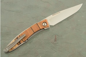 This Mnandi features spalted beech wood scales. The scales are inlaid into the frame rather than being simple overlays. The blade is made from S35VN stainless steel, hardened to 58-59 Rc for strength and keen edge retention. Both the frame and pocket clip are formed from 6Al4V titanium, keeping this knife extremely light and durable. The clip is mounted for tip up carry. The knife can be comfortably opened and closed with one hand and locks open for safety. The thumb rest is fileworked for dependable handling. The Mnandi features a strong integral locking mechanism that Chris Reeve popularized.