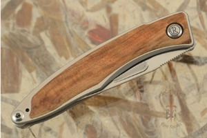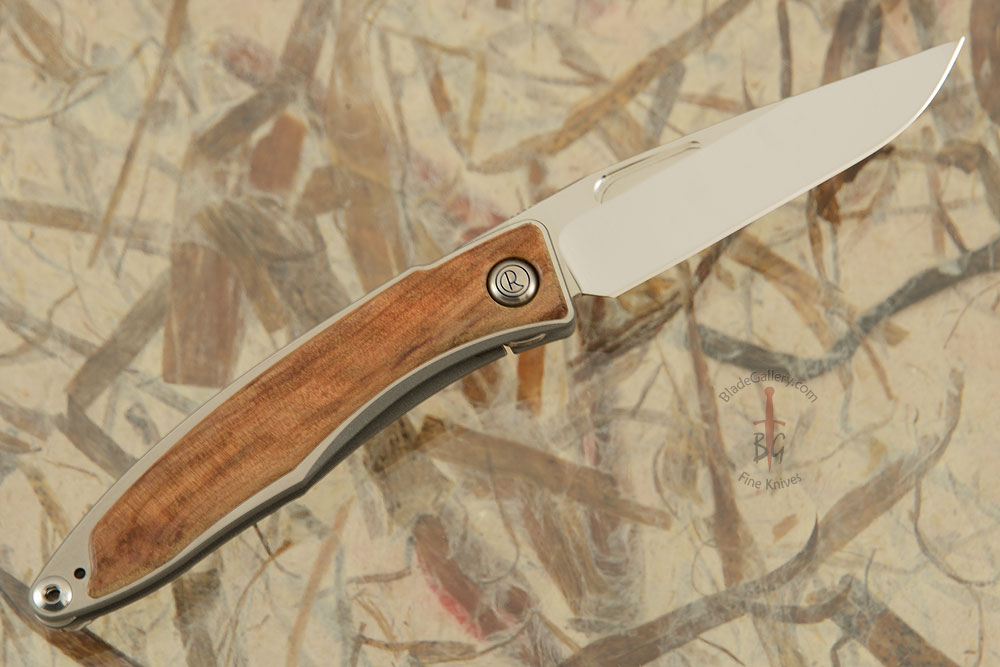 This Mnandi features thuya burl (Tetraclinis articulata) set into the titanium frame. The wood is inlaid into the frame rather than being simple overlays. The blade is made from Crucible S35VN steel, hardened to 58-59 Rc for strength and keen edge retention.