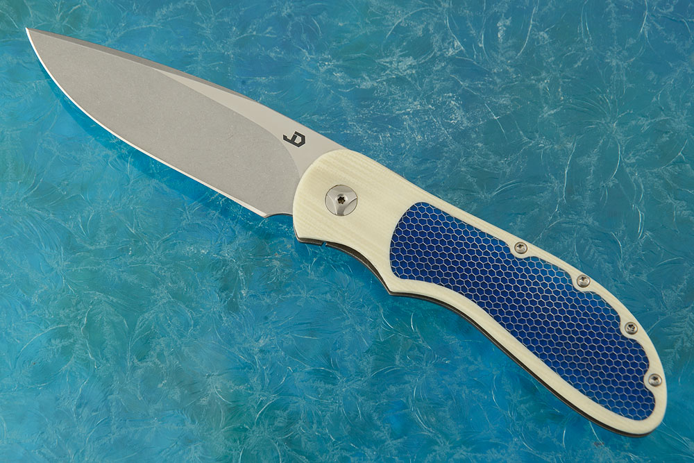 The front frame is formed from white G-10 Is has been meticulously inlaid with blue C-Tek. C-Tek resin infused aluminum honeycomb is a material that has been "in the works" since 1995. The material is absolutely stunning in its appearance and its ability to reflect light and gives a whole new depth to the knife making art. The back frame is formed from stonewashed titanium. A G-10 backbar keeps the knife rigid, yet light. This thin-profiled handle is compact enough to keep in the pocket and never notice it until it is needed. The pierced, deep-carry titanium pocket clip is mounted for right-handed, tip-down carry.