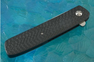 A glass bead blasted grade 5 titanium frame ensures this mid-size folder will be light in the pocket, yet have tremendous strength and durability. Each side features a green TechnoCarbo inlay. Screws throughout were made in the Arno Bernard workshop and are grade 4 titanium, allowing them to be anodized. Ensuring rigid, yet light construction, the backspacer is grade 5 titanium.