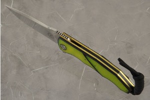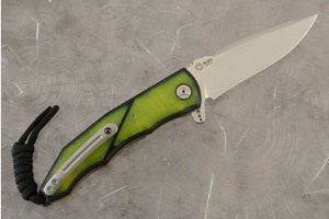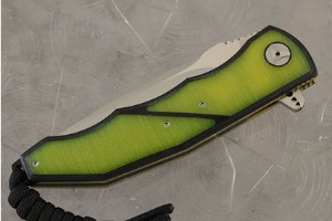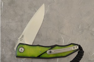 The scales are formed from black G10 and are inlaid with translucent green G10 inlays. Jimping on the thumb ramp aids grip. The flipper doubles as a front guard that keeps the hand from sliding forward onto the blade. The gently rounded handle feels sturdy and fills out the hand perfectly. Bronze anodized titanium liners elegantly contrast against the scales. The machined titanium pocket clip is mounted for right-handed, tip-up carry. The handle is completed with a cord lanyard.