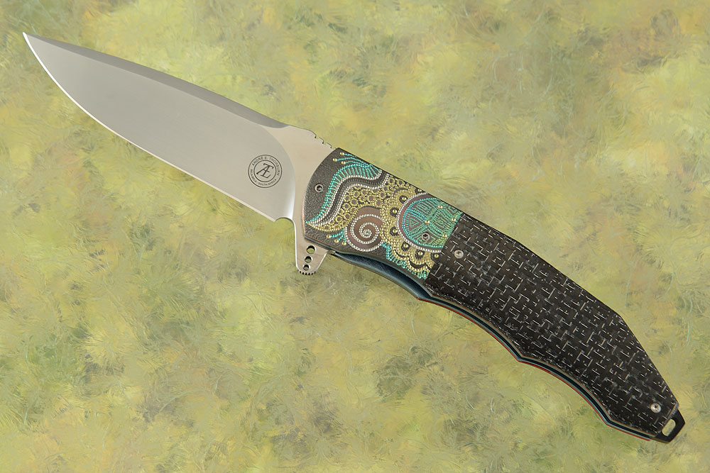 The scales are formed from silver strike carbon fiber. Aluminum wires are woven through the carbon fiber. Jimping on the thumb ramp provides a comfortable, secure grip. The gently rounded handle feels sturdy and fills out the hand perfectly. This combination nicely complements anodized and engraved zirconium bolsters. The bolsters have an elegant iridescence that is quite captivating. Zirconium is a transitional metal that is primarily mined in South Africa and Australia. It is resistant to scuffing and corrosion. The handle is completed with anodized titanium liners and a 3D machined titanium pocket clip with ceramic ball mounted for right-handed, tip-up carry.