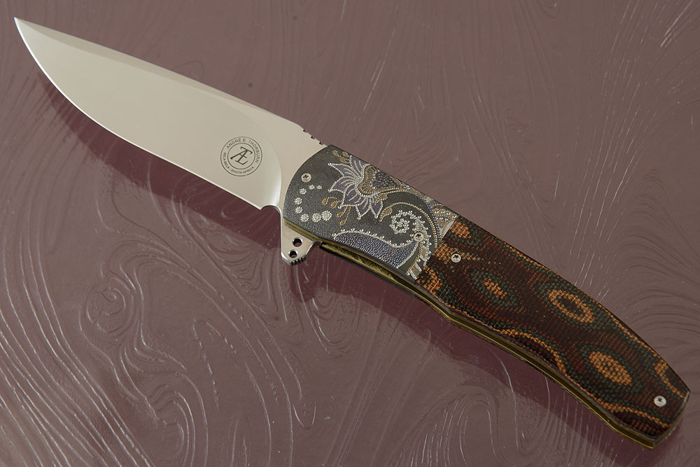 Description: South African knifemaker André Thorburn creates an exceptional folder. The blade is perfectly centered with silky-smooth action.