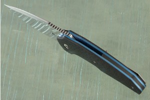 The scales are formed from carbon fiber. Jimping on the thumb ramp aids grip. The gently rounded handle feels sturdy and fills out the hand perfectly. The handle is completed with blue anodized titanium liners. The ultra-light titanium pocket clip is mounted for tip-up, right-handed carry.