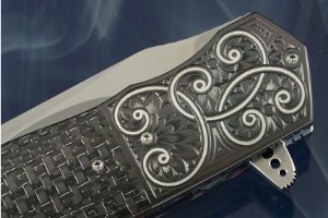 The scales are formed from silver strike carbon fiber. Silver toned wires are woven into the carbon fiber in this variation of lightning strike carbon fiber. Jimping on the thumb ramp provides a comfortable, secure grip. The gently rounded handle feels sturdy and fills out the hand perfectly.