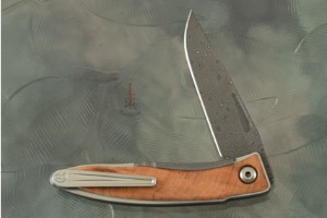 This Mnandi features thuya burl (Tetraclinis articulata) set into the titanium frame. The blade is made from Chad Nichols' stainless raindrop pattern damascus. The steel will have exceptional edge holding and is immediately captivating.