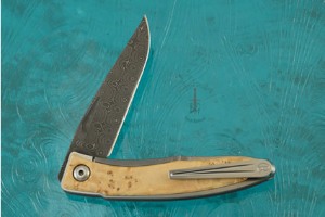 This Mnandi features premium box elder burl scales with a stainless damascus blade. The scales are inlaid into the liners rather than being simple overlays. The blade is made from Chad Nichols' stainless raindrop pattern damascus. The steel will have exceptional edge holding and is immediately captivating. Both the liners and pocket clip are formed from 6Al4V titanium, keeping this knife extremely light and durable. The clip is mounted for tip up carry. The knife can be comfortably opened and closed with one hand and locks open for safety. The thumb rest is fileworked for dependable handling. The Mnandi features a strong integral locking mechanism that Chris Reeve popularized.