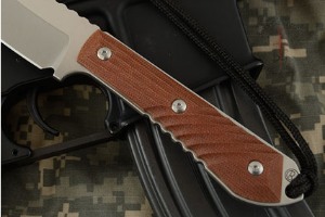 The CPM S35VN tang and blade results in a knife that is sturdy and practical. This steel from Crucible features a particularly small crystal structure caused by the inclusion of Niobium as a grain refiner. Micarta scales are carved with spiral and linear grooves, providing a sure grip. Serrations on the spine ensure a secure thumb purchase.